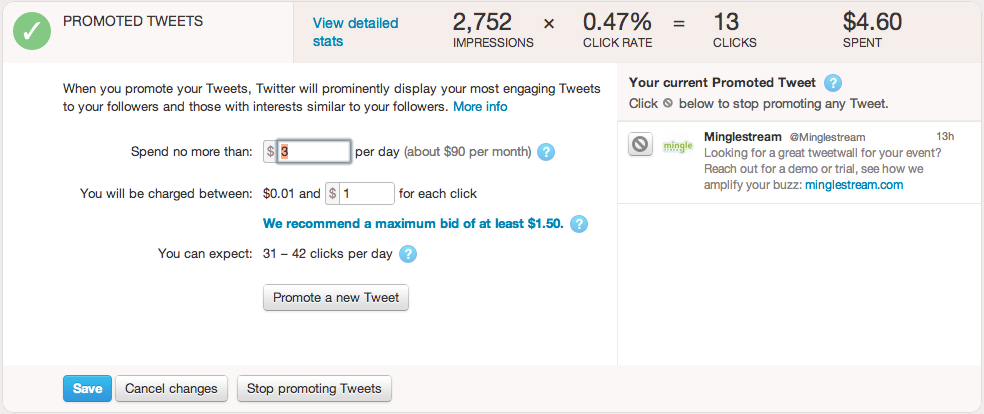You will be pleased to know that small business can create their own budget when using Twitter for advertising. With Twitter advertising, you get out as much as you put in. As you can see below, I opted to promote @Minglestream tweets and the entire account. The cool thing it that I was able indicate how much I wanted to spend per day on advertising.